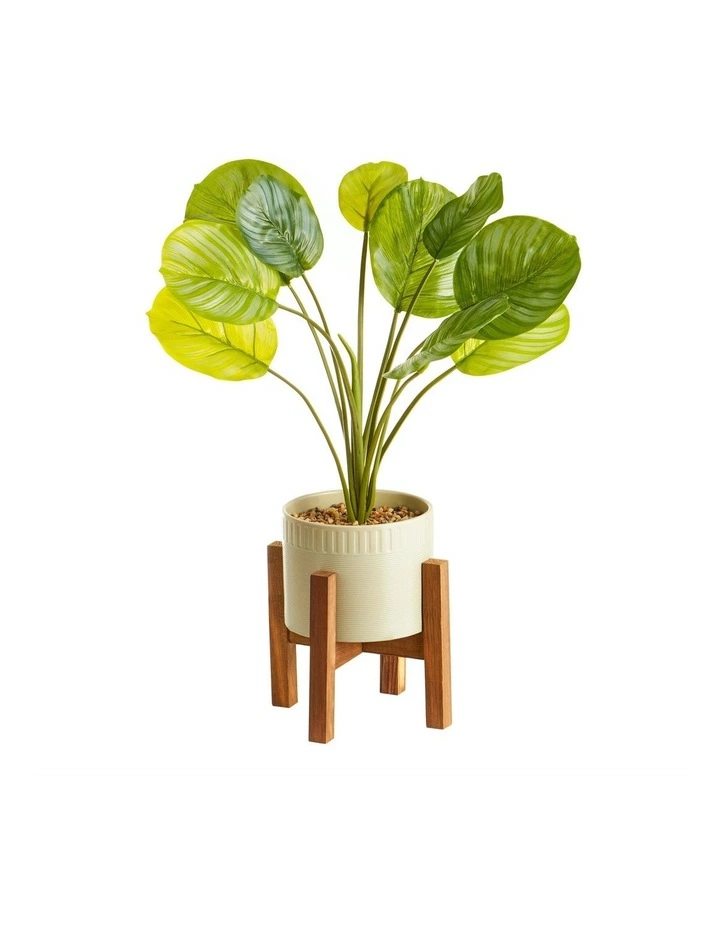 Made of high-quality soft and realistic plastic, the Potted Artificial Taro Plant is durable and long-lasting. Nestled inside an understated, beautiful round ceramic pot and a sturdy wooden stand for versatile appeal. The soft plastic mimics the natural colour and texture of its live counterpart.It is low maintenance and needs minimal attention and cleaning compared to real plants.