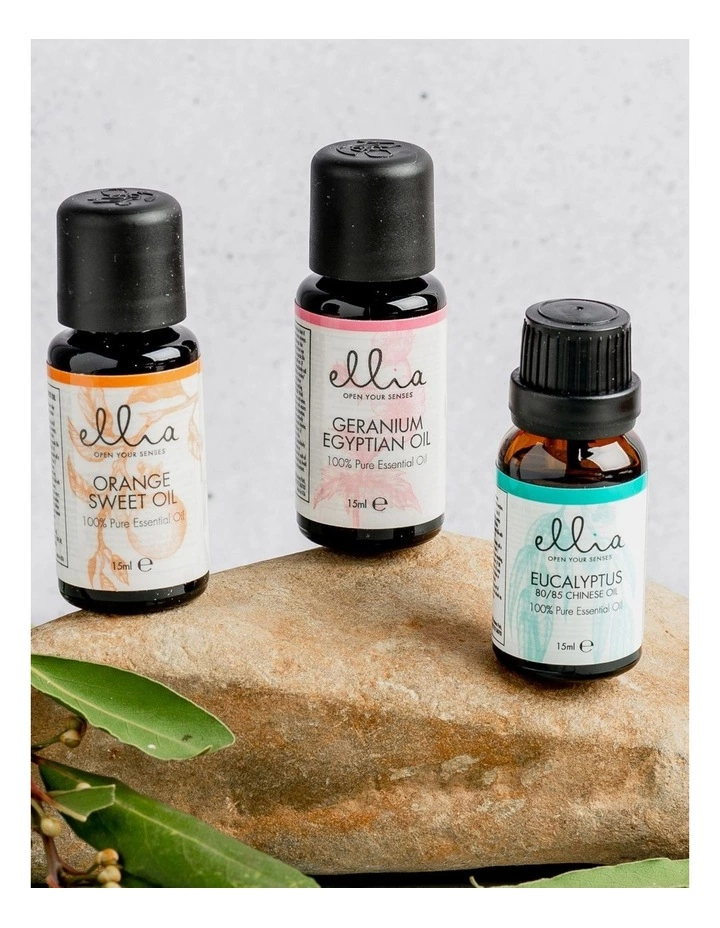 The Ellia Triple Pack Essential Oils with Eucalyptus/Orange/Geranium lets you create a relaxing environment in your room to eliminate unwanted odours and calm your senses.