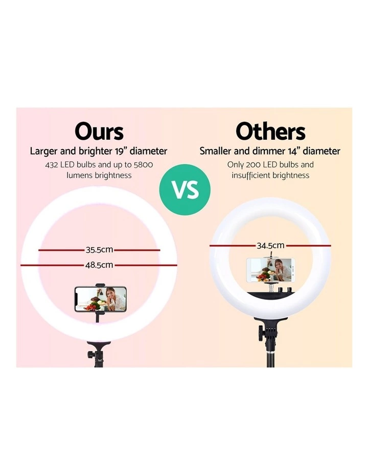 The 5800 lumens ring light fits easily on any standard camera stand and is height adjustable from 80cm to 200cm with a 360rotatable use. The light also comes with a bonus double-sided mirror to assist with makeup, and a carry bag for easy transportation.
