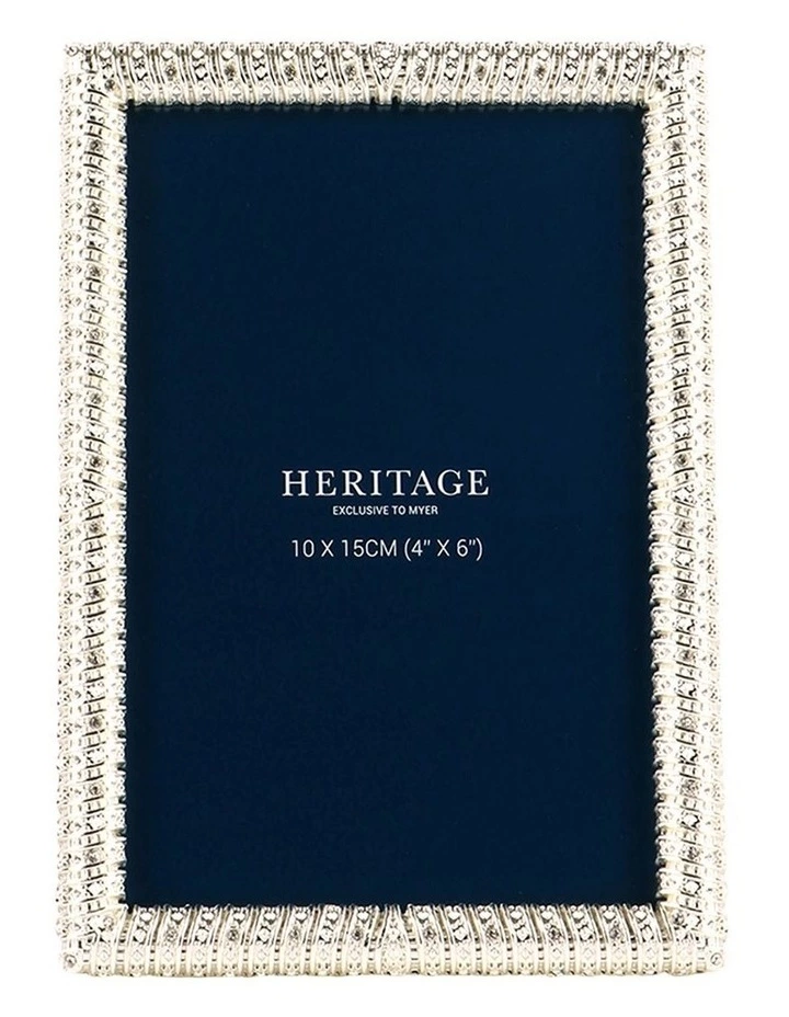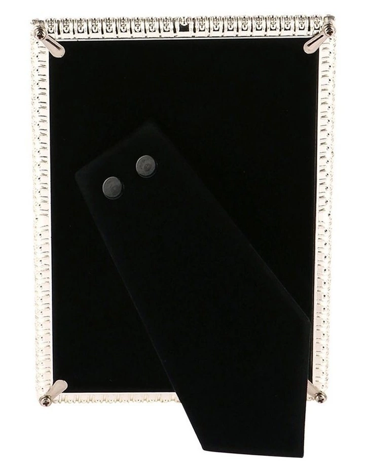 Zinc Alloy photo frame with glass. Frame size: 10x15cm. Velvet easel backing allowing it to sit horizontally and vertically
