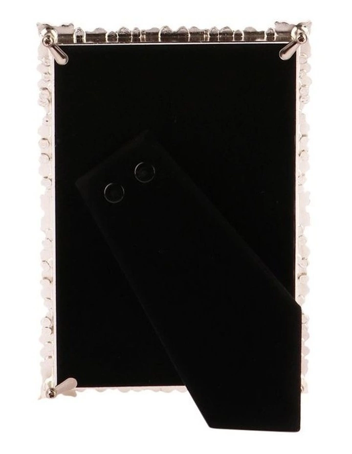 Zinc Alloy photo frame with glass. Bejewelled edges. Frame size: 10x15cm (4x6in). Easel velvet backing allowing it to sit horizontally and vertically