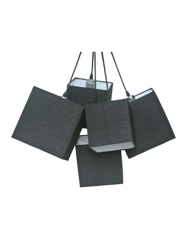 Cluster pendant light with a grouping of 5 square black fabric shades of various sizes.