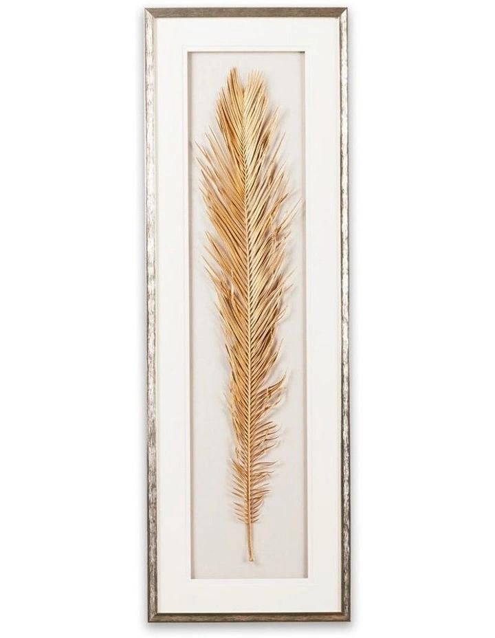 A stunning shadowbox featuring a long golden leaf. Looks great in a pair!