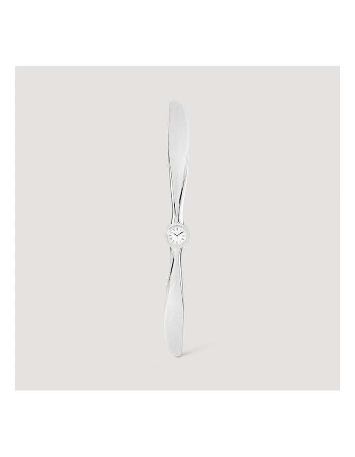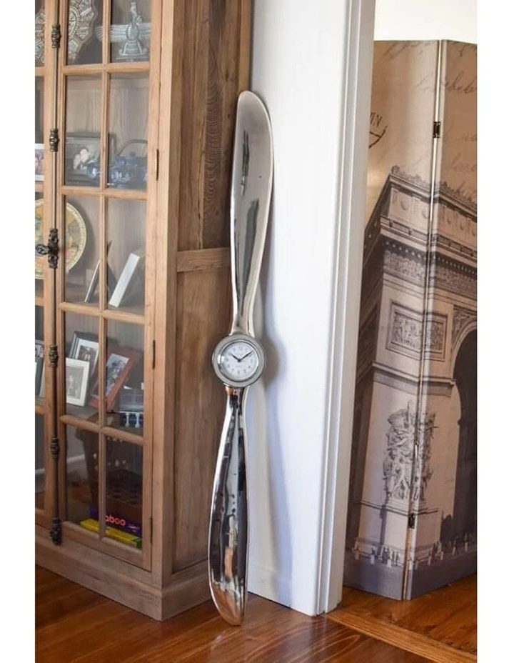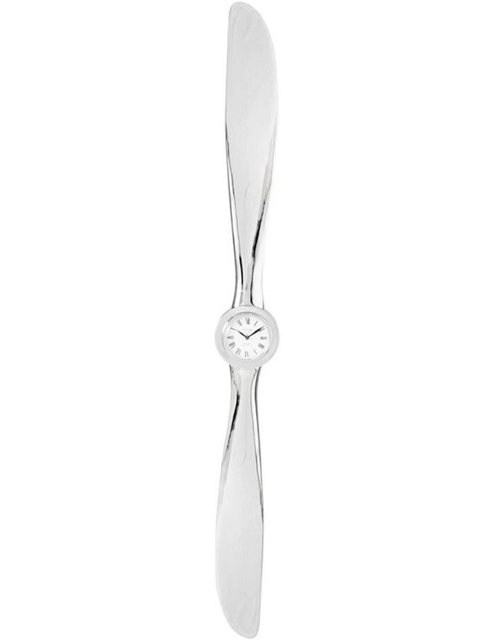 A truly unique clock with a long aeroplane design comprised of nickel.