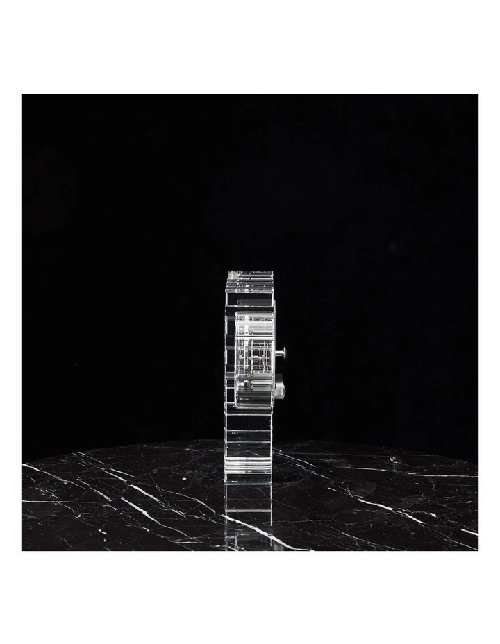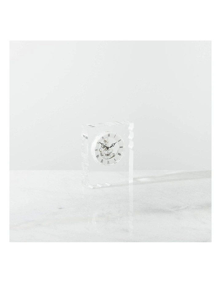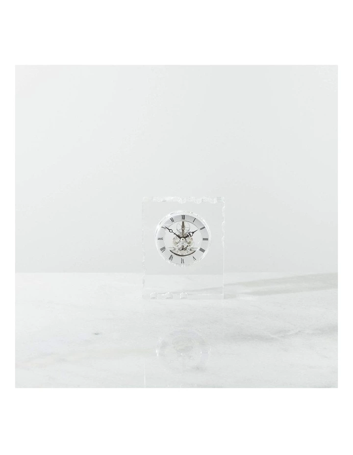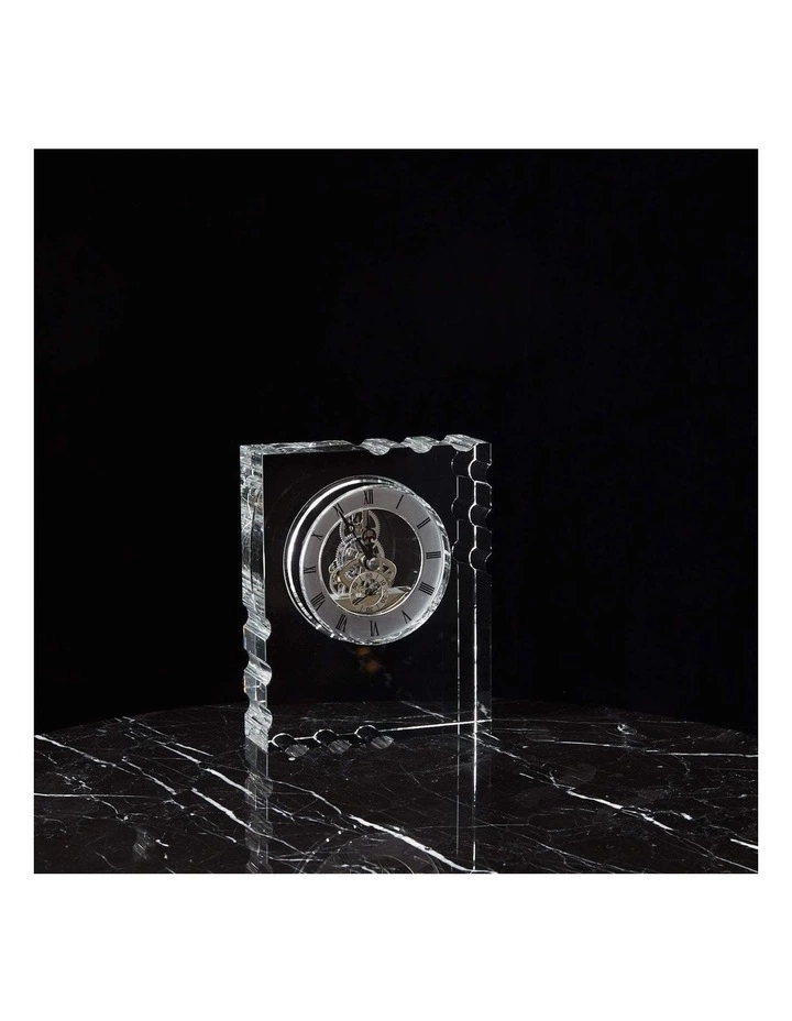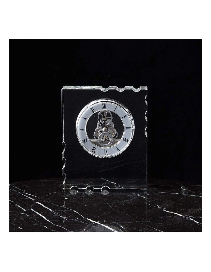 A unique crystal clocking featuring a visible gears and a silver face, complete with corrugated edges.