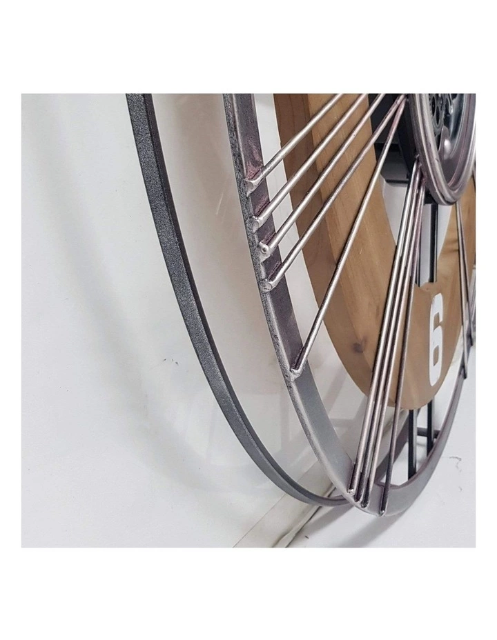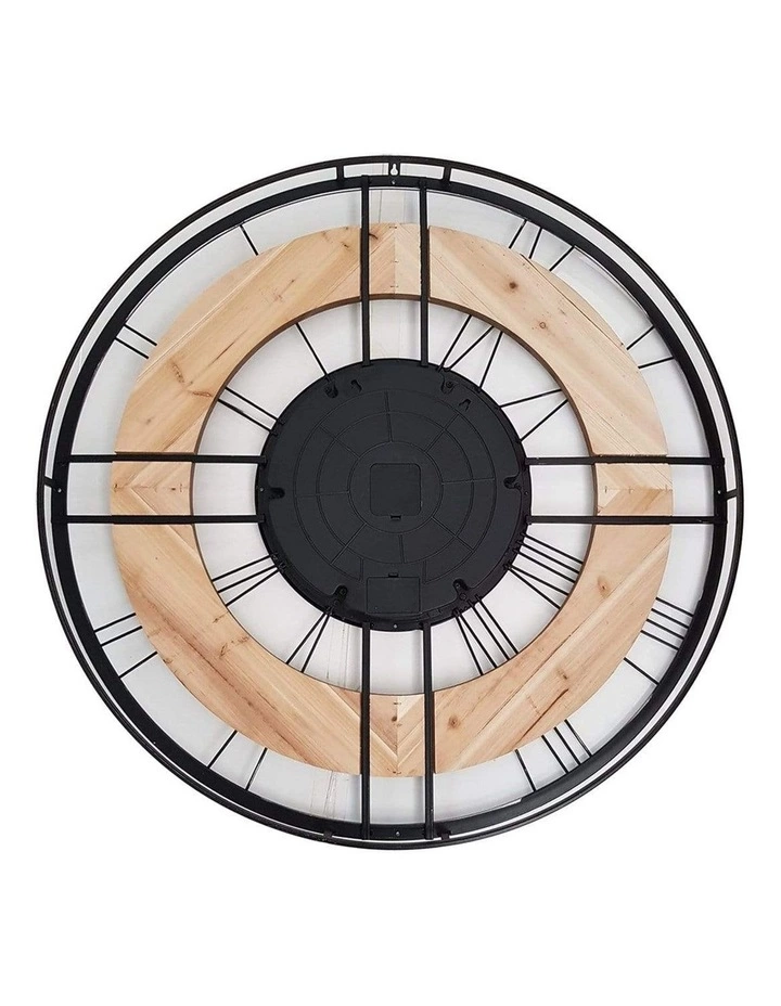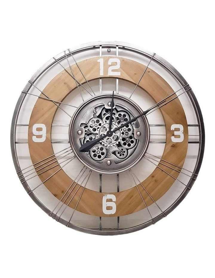 The frame is made of pure metal with an antique rustic washed finish that contrasts perfectly with the wooden inner board that features just the necessary increments of time, giving the clock that warm country feel. The unpolished look provides a neutral aesthetic, while the visible inner mechanisms and cut out details provide visual interest. This Skeleton Clock has an exposed gear movement, thus you are able to view the "skeleton" of the movement in the clock Exposed gears rotate to fuel the rhythm of the clock’s slender black hands.