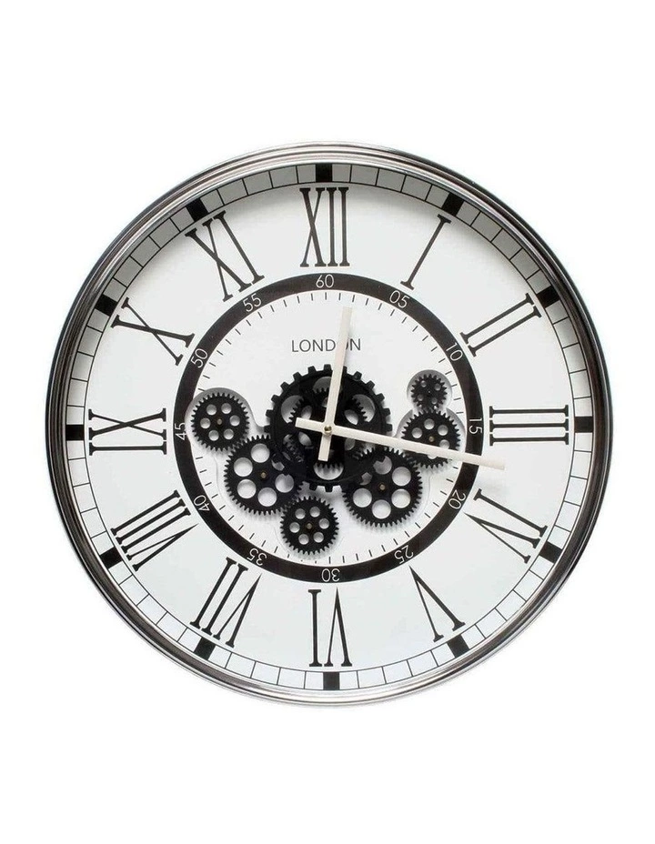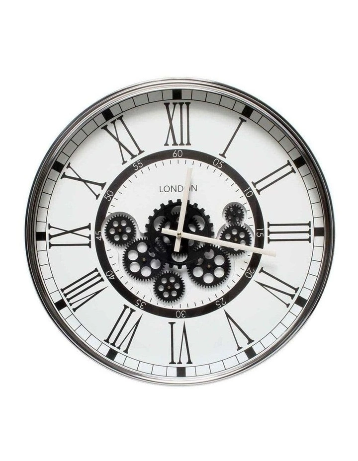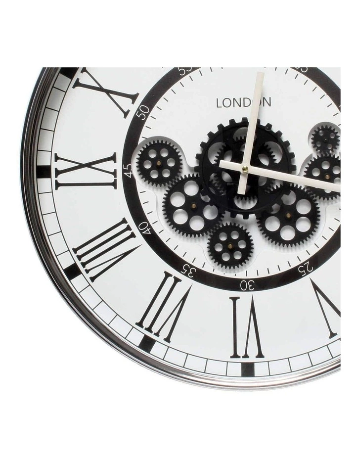 Clean, sophisticated and modern, this beautifully crafted wall clock puts the popular in mechanics. The visible inner mechanisms and cut out details provide visual interest. The frame is made of pure metal with a clean, modern finish.