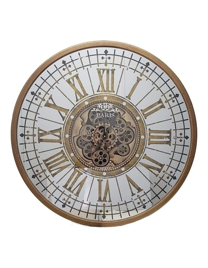 The classical Parisan style of this stunning wall clock puts the popular in mechanics. The unpolished mirrored face provides a neutral aesthetic, while the visible inner mechanisms and cut out details provide visual interest. The frame is made of pure metal with an antique rustic washed metal finish and the clock face is hand-carved from solid wood.