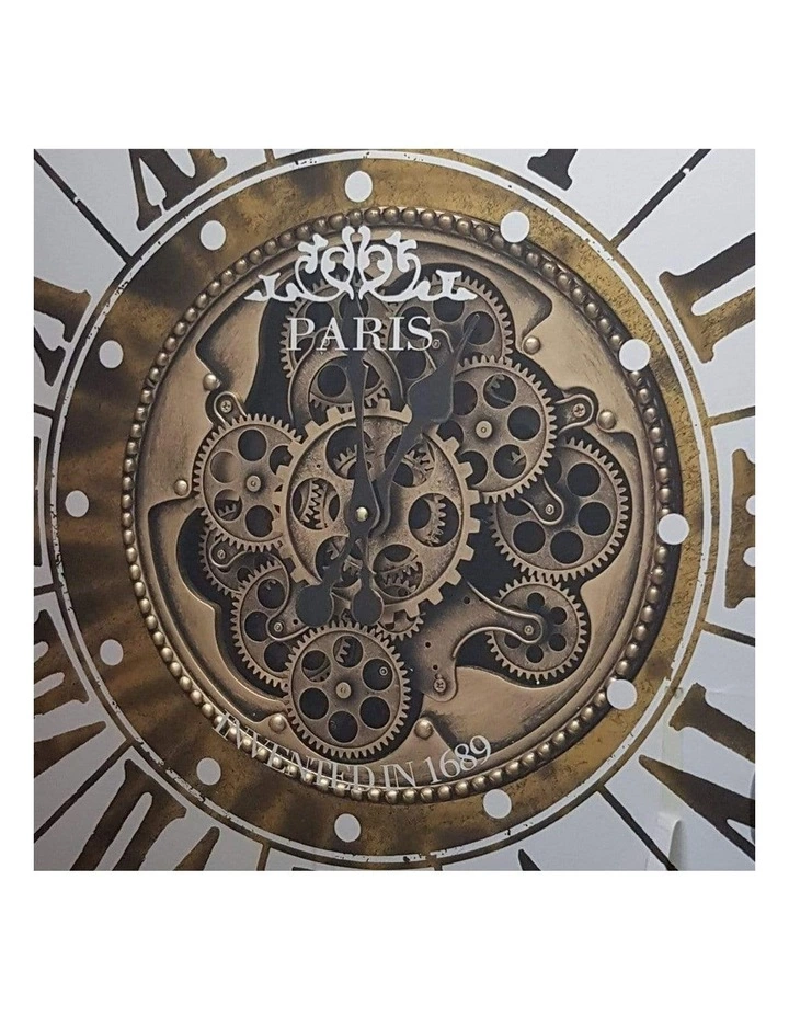 This clock has an exposed gear movement, thus you are able to view the "skeleton" of the movement in the clock. Exposed gears rotate to fuel the rhythm of the clock’s slender black hands, leaving admirers mesmerised and in a hypnotic state as they watch the gears rotate in perfect unison. A stunning way to tell the time, this wall clock is feature piece for anywhere in the home where time and place are key.
