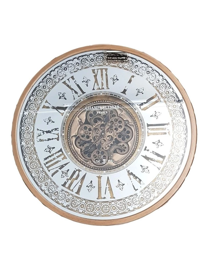 D80cm Round Mirrored Persian moving cogs Clock Gold. Clean, sophisticated and modern, this beautifully crafted wall clock puts the popular in mechanics. The industrial look provides a neutral aesthetic, while the visible inner mechanisms and cut out details provide visual interest. The frame is made of pure metal with a clean finish and the clock face is hand-carved from solid wood.