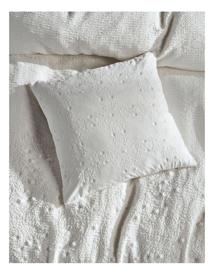This beautifully embroidered cushion, made from a soft, cotton velvet in white, exudes vintage romance.