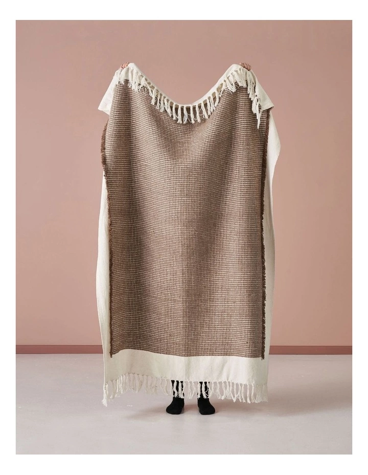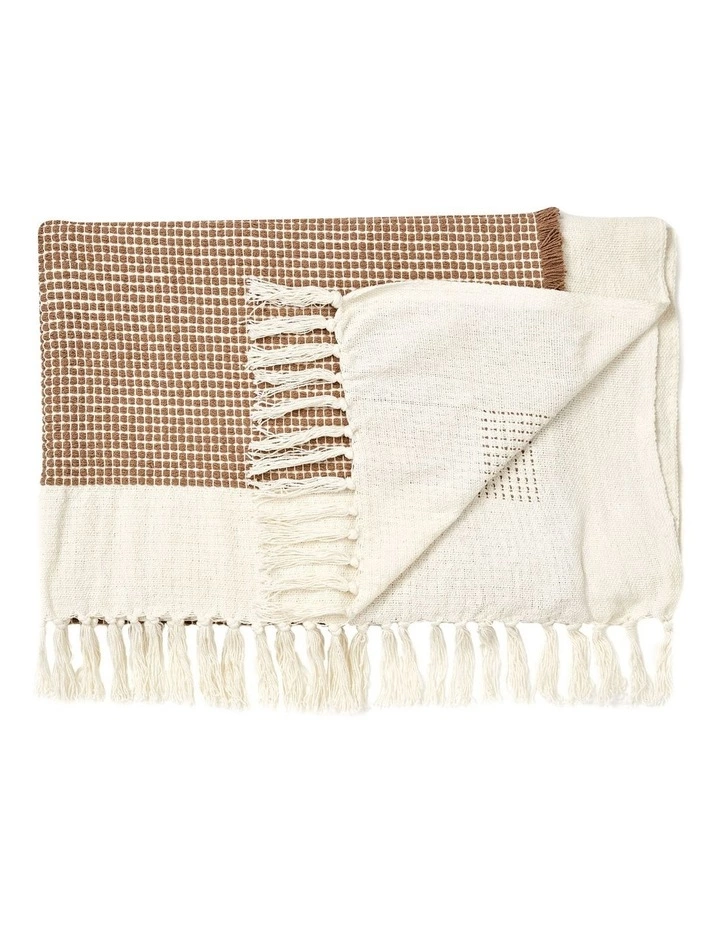 Its woven design in an on-trend and stylish mushroom hue enjoys a beautifully soft handle, complete with a fringed edge.