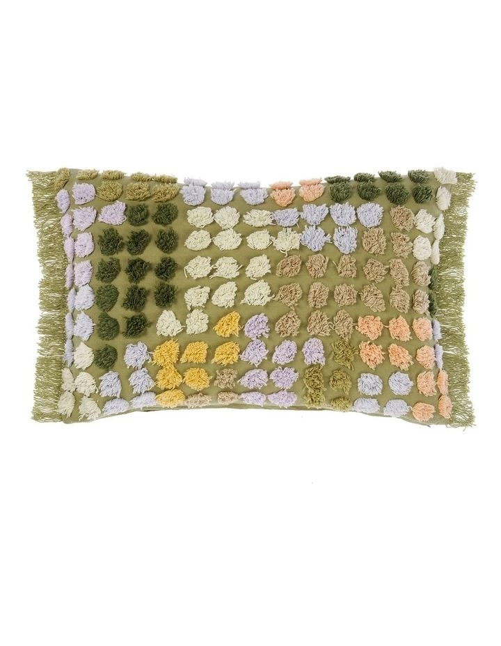 A total "it" accessory, fluffy, multi-coloured spots adorn this marvellously lively cushion, which features dominant fern hues throughout.
