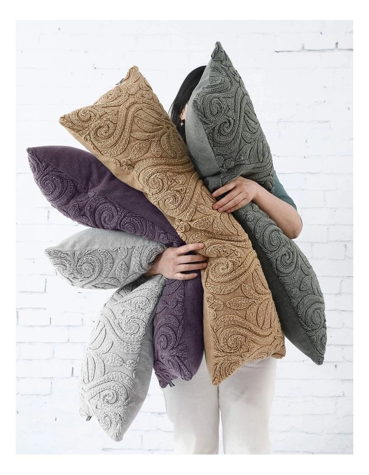 Constructed from a soft cotton in chestnut, Malta is adorned with crewel embroidery along the length of its cushion.