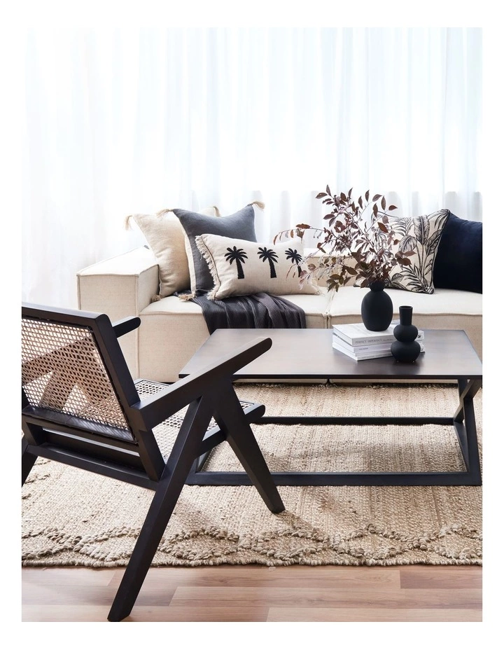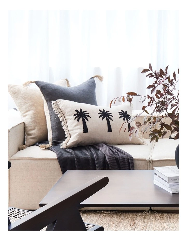 Natural Linen Base With Fringing On Two Short Sides, Black Palm Embroidery And Black Dobby Stitch On Two Sides Of Cushion. Zip With Flap 10Cm From Base Of Cushion.