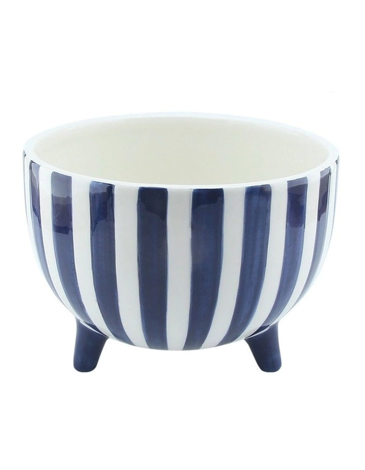 Our Fraser Planter features a round shape base with three small feet and is finished with a hand painted stripe design. Each unique piece brings a special artisan feel to your home.