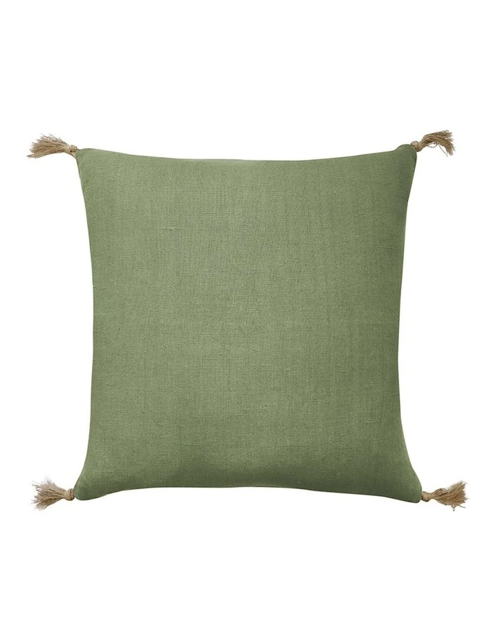 Our Goa Linen Tassel Cushion features a green linen front with a knotted natural linen tassel on each corner. It is finished with a natural linen reverse and a duck feather filler.
