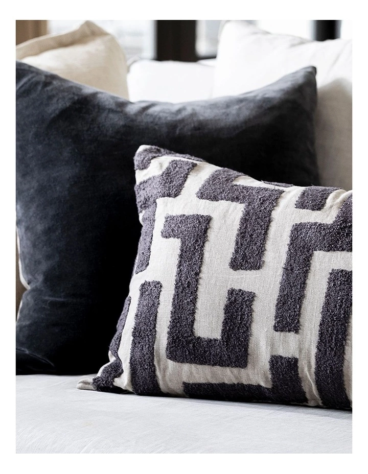 Embroidered design in Charcoal on natural linen with natural linen reverse and knife edge. Concealed zip.