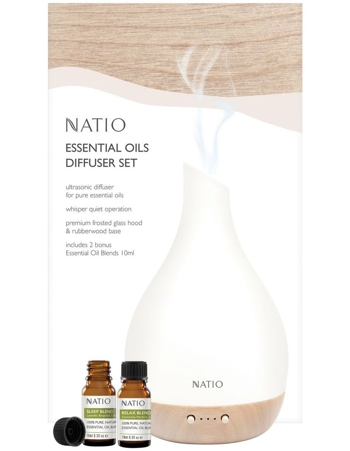 Aroma gift set includes a premium glass and rubberwood Ultrasonic Diffuser plus bonus Pure Essential Oils – Relax 10ml and Pure Essential Oil – Sleep 10ml, presented in a Natio gift box.