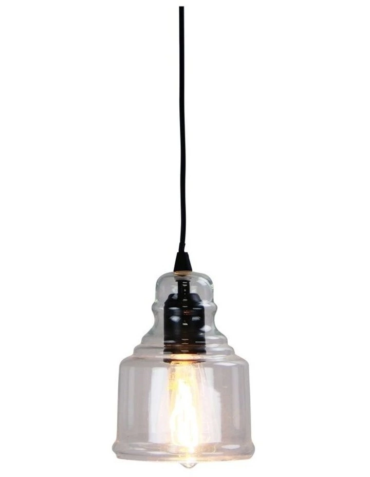 AUBURN clear handblown glass single pendant. Supplied with a black 1.8m suspension and E27 lamp holder. Ideal for clustering, over meals or stairwells. Available in three glass shapes, of similar size. Nice choice for retro, modern or Hamptons style home.