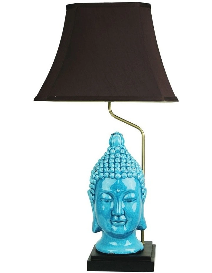 Our Jade Buddha ceramic table lamp will sweep you away to a place of serenity. Superbly aged, with a crazed and scarred, high gloss finish in stunning teal, Buddha sits upon a black pedestal. The dark chocolate shantung, waisted pagoda shade is supported by an antique brass rod.
