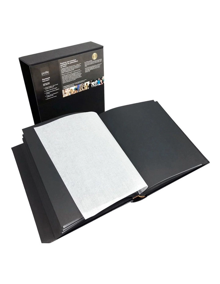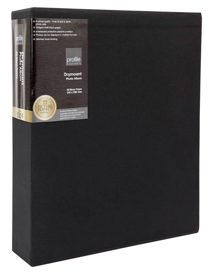 The Regal Black Drymount photo album feathers a leather look cover, 250gsm black pages with glassine interleaving between each page to protect your photo, book bound binding contruction and hard sleeve box to store your album for safe keeping. All albums are acid and lignin free and comes with the Profile Life time Guarantee. Album suits multi size photos per page. Can be used for scrapbooking as well.