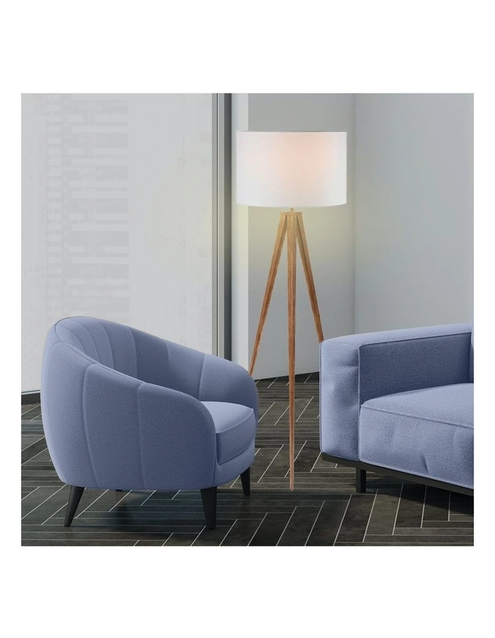 The wood-effect tripod lets you enjoy the look of natural materials with the durable qualities of metal. Its legs narrow into fine points, giving this lamp a dramatic look while remaining sturdy and stable. The floor lamp also comes with a white drum shade that casts an ambient glow.