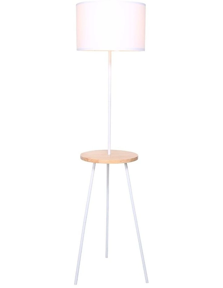 Save floor space in your living room, bedroom, or office with this unique tripod floor lamp. It features a wooden tabletop that’s perfect for displaying photos or keeping remotes, smartphones, and other essential items nearby.
