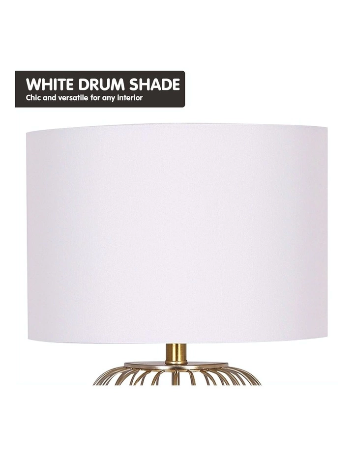 This modern table lamp features an elegant, hollow base in a rose gold finish. Topped off with a simple fabric drum shade, it exudes effortless style and romance perfect for contemporary interiors.