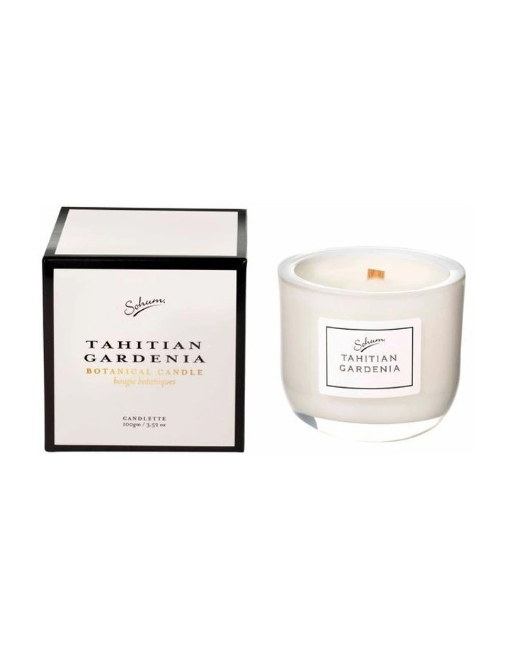 SOHUM Candlette made with botanical waxes induces a soft ambient glow infused with vivid fragrance for optimum burning. Tahitian Gardenia notes: Calla Lily, White Gardenia, Tiare, Osmanthes, Tuberose.