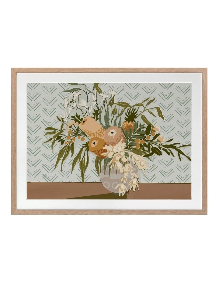 Country’s Finest Print Oak Frame – Earthy, fresh and grounded, this painterly style still life artwork features a vase full of wild Australian Natives, including banksia, lilly pilly, kangaroo paw and gum leaves. The colour palette is warm and muted, featuring warm, olive and khaki green foliage and golden brown flora against a powder blue background. FRAMED ART: Giclee printed using archival inks and paper – which means no fading! Framed with a quality moulding and mounted behind museum grade plexiglass. Comes ready to hang.