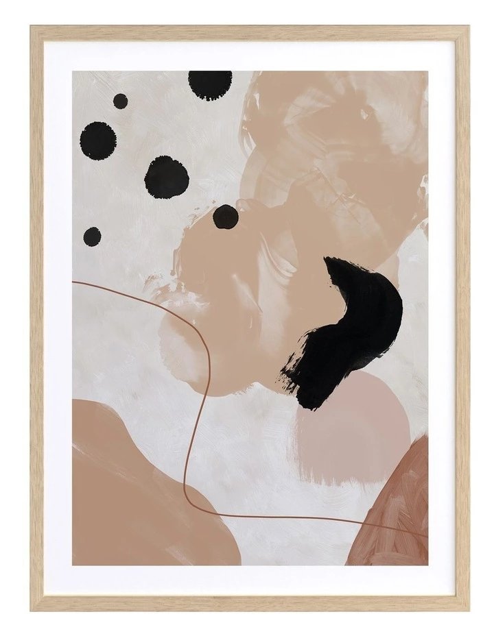 Creme Brulee I Framed Print: An organic, abstract artwork that features overlapping shapes, washes, lines and dots in a warm, neutral colour palette. Pairs with Creme Brulee II.FRAMED ART: Giclee printed using archival inks and paper – which means no fading! Framed with a quality moulding and mounted behind museum grade plexiglass. Comes ready to hang.