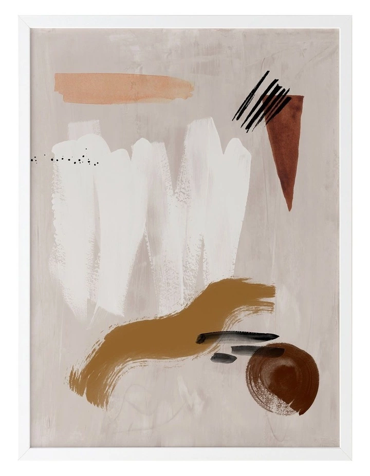 Dig Site I Framed Art Print – An earthy and grounded abstract artwork that features playful shapes, strokes and textures in shades of white, brown, peach and terracotta against a background wash of beige. Pairs with Dig Site II.FRAMED ART: Giclee printed using archival inks and paper – which means no fading! Framed with a quality moulding and mounted behind museum grade plexiglass. Comes ready to hang.