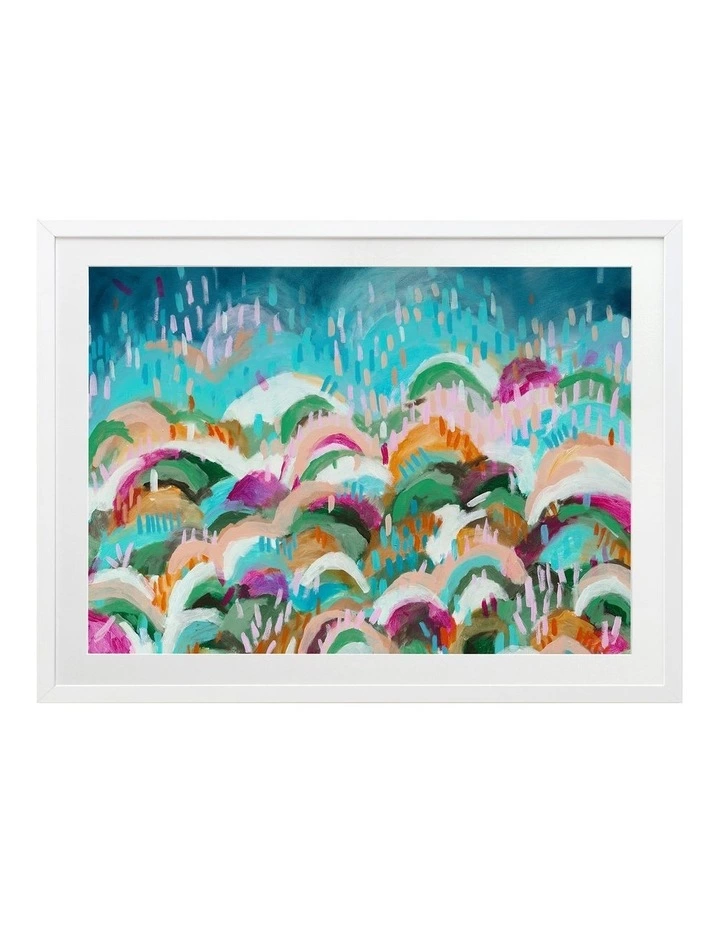 Rainbow Hills Print White Frame – This artwork is inspired by that little road that no-one else knows about – the place where you can let yourself go, and become one with nature. This dreamy landscape features painterly brush strokes, line work and beautiful layers in a richly vibrant colour palette of aqua, blue, fuschia pink, and orange. FRAMED ART: Giclee printed using archival inks and paper – which means no fading! Framed with a quality moulding and mounted behind museum grade plexiglass. Comes ready to hang.