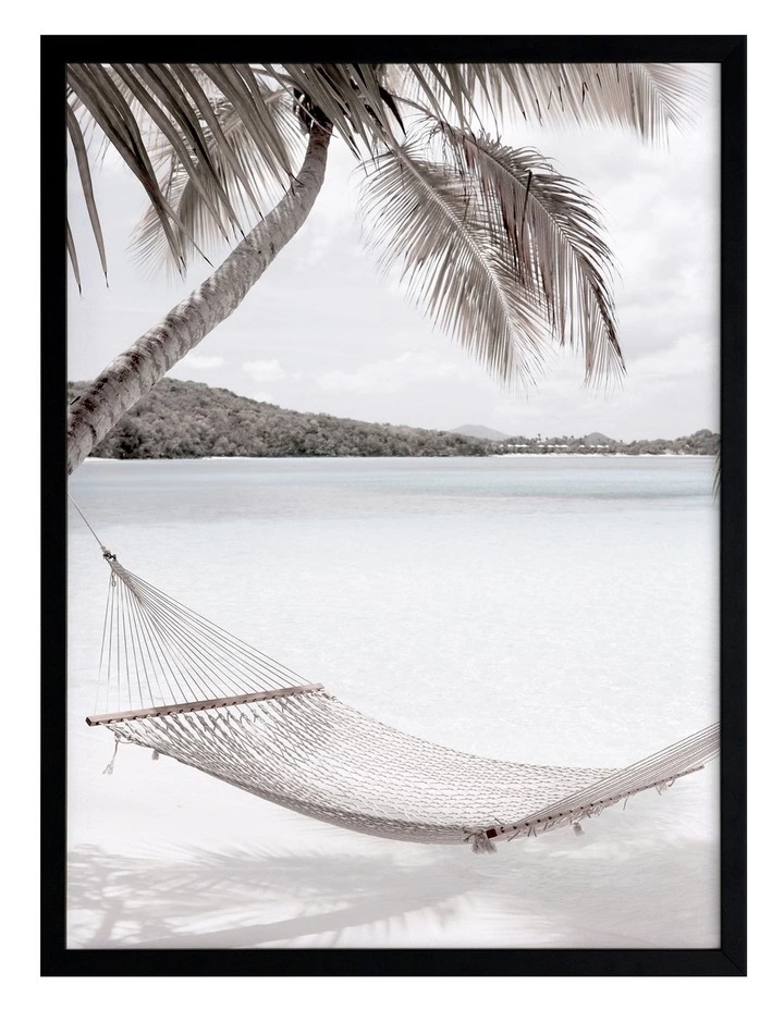 Rest Easy Print Black Frame – Kick back and relax in a tropical oasis with this photographic print, featuring a hammock hung between two palm trees, overlooking a beautiful bay.FRAMED ART: Giclee printed using archival inks and paper – which means no fading! Framed with a quality moulding and mounted behind museum grade plexiglass. Comes ready to hang.