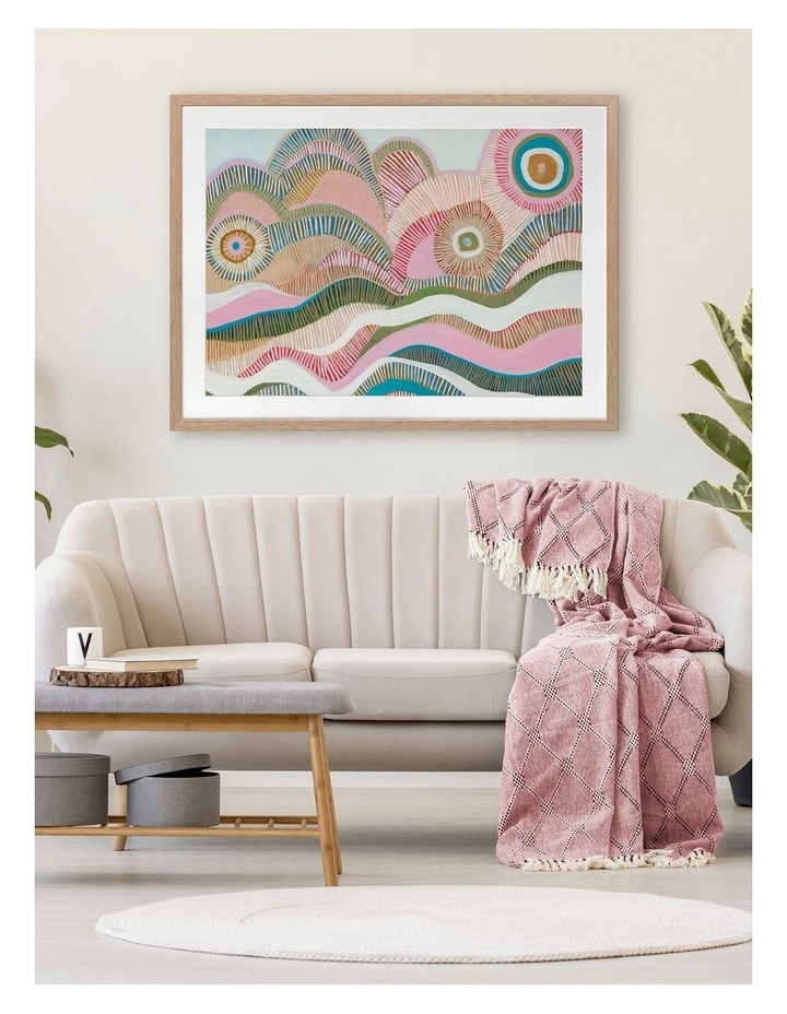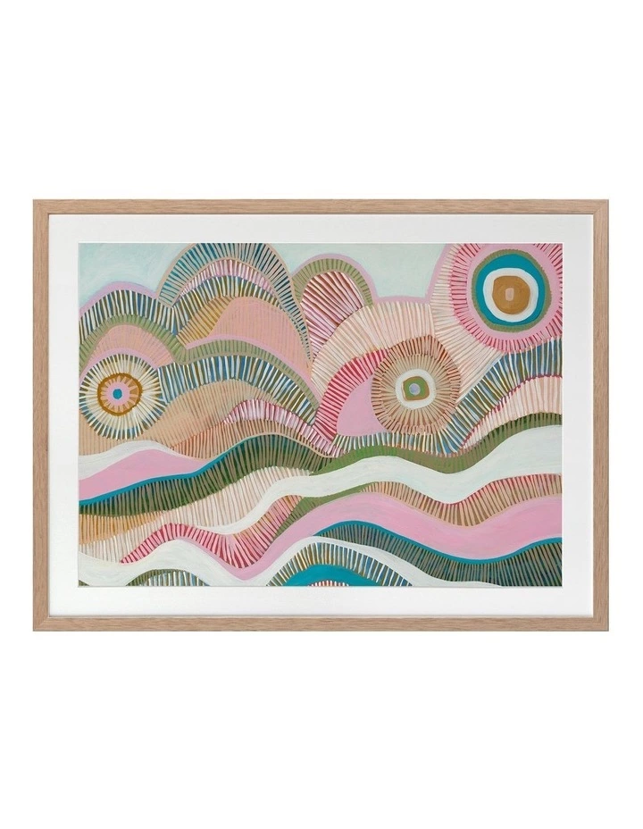 Sail Away Print Oak Frame – Playful and meditative, this artwork showcases the impacts of texture, line and shape to create the feeling of calm and serenity. The soft, pastel colour palette features pink, mint green and peach, alongside deeper muted green and teal accents. FRAMED ART: Giclee printed using archival inks and paper – which means no fading! Framed with a quality moulding and mounted behind museum grade plexiglass. Comes ready to hang.