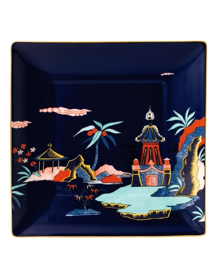 Oriental inspired motifs create an enchanting look to the Blue Pagoda Tray. Crafted from fine bone china, this tray features an Oriental playful and whimsical garden scene is set against a powerful french navy background.