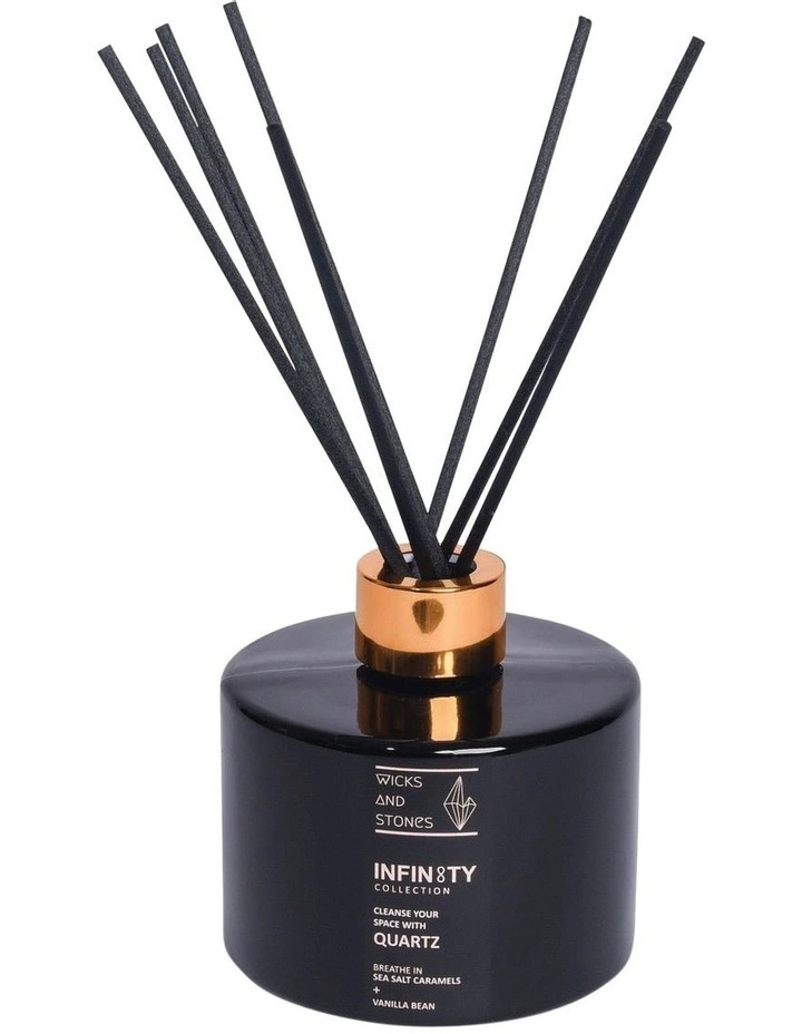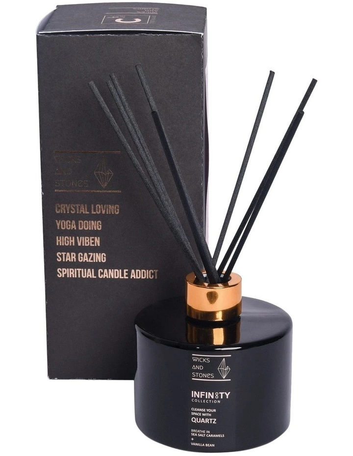 The Wicks and Stones Infinity, Quartz Crystal Reed Diffuser is a balanced blend of salted caramel and creamy vanilla to fill your space with a sense of clarity. It includes one quartz stone to promote healing, balance, clarity and positive energy.