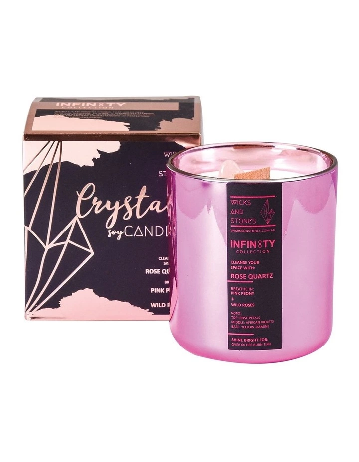 Rose Quartz: A tender blend of African violet and rose fills your space with loving energy. It includes one rose quartz crystal to promote friendship and healing.